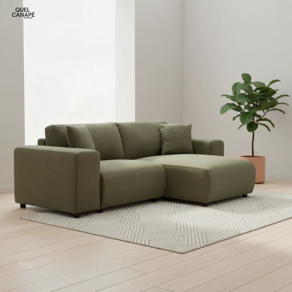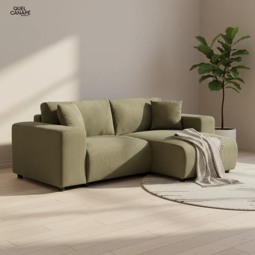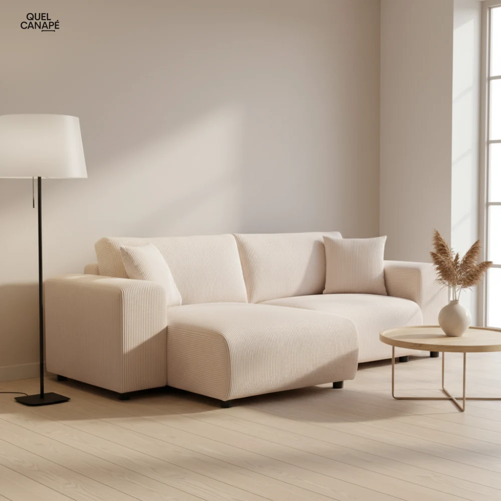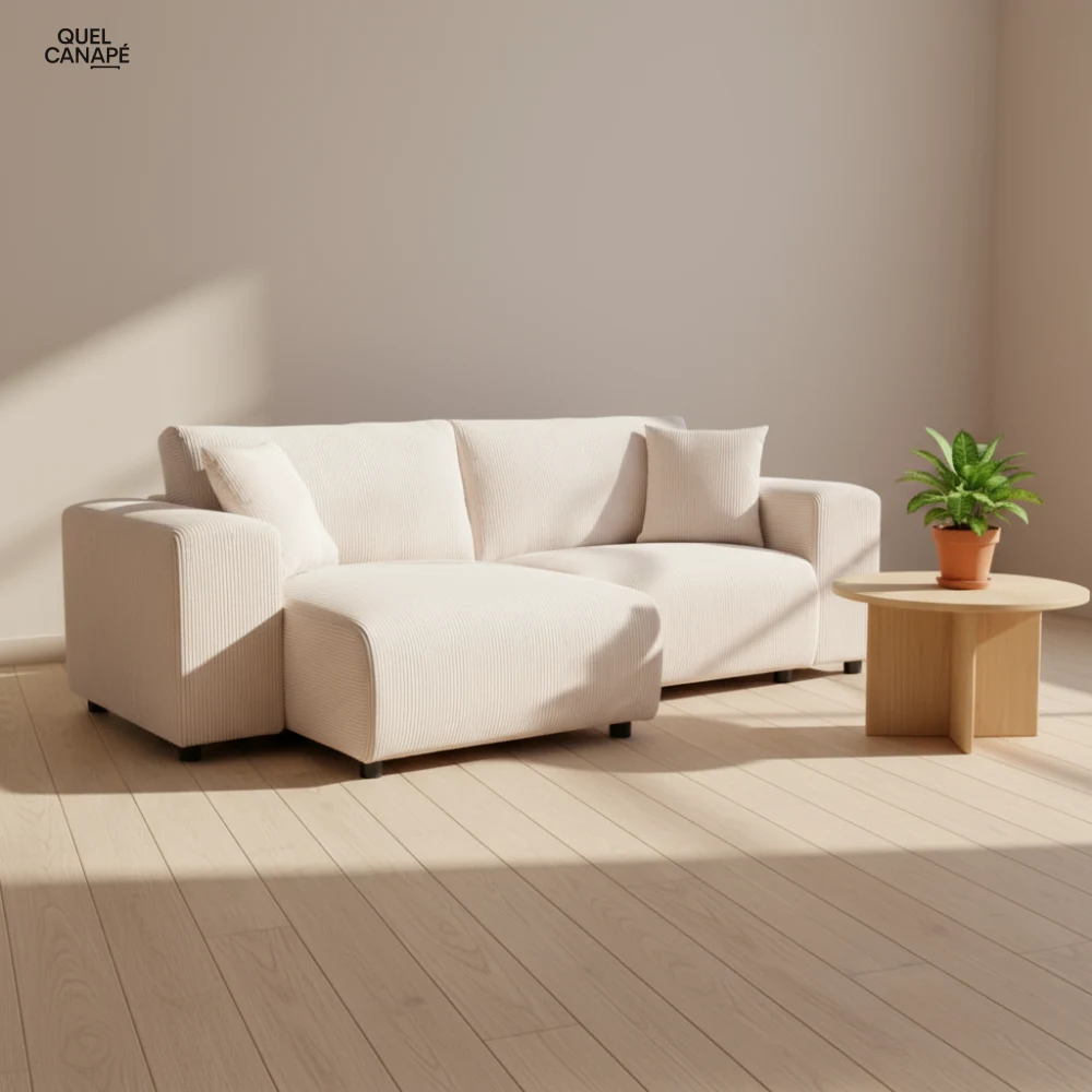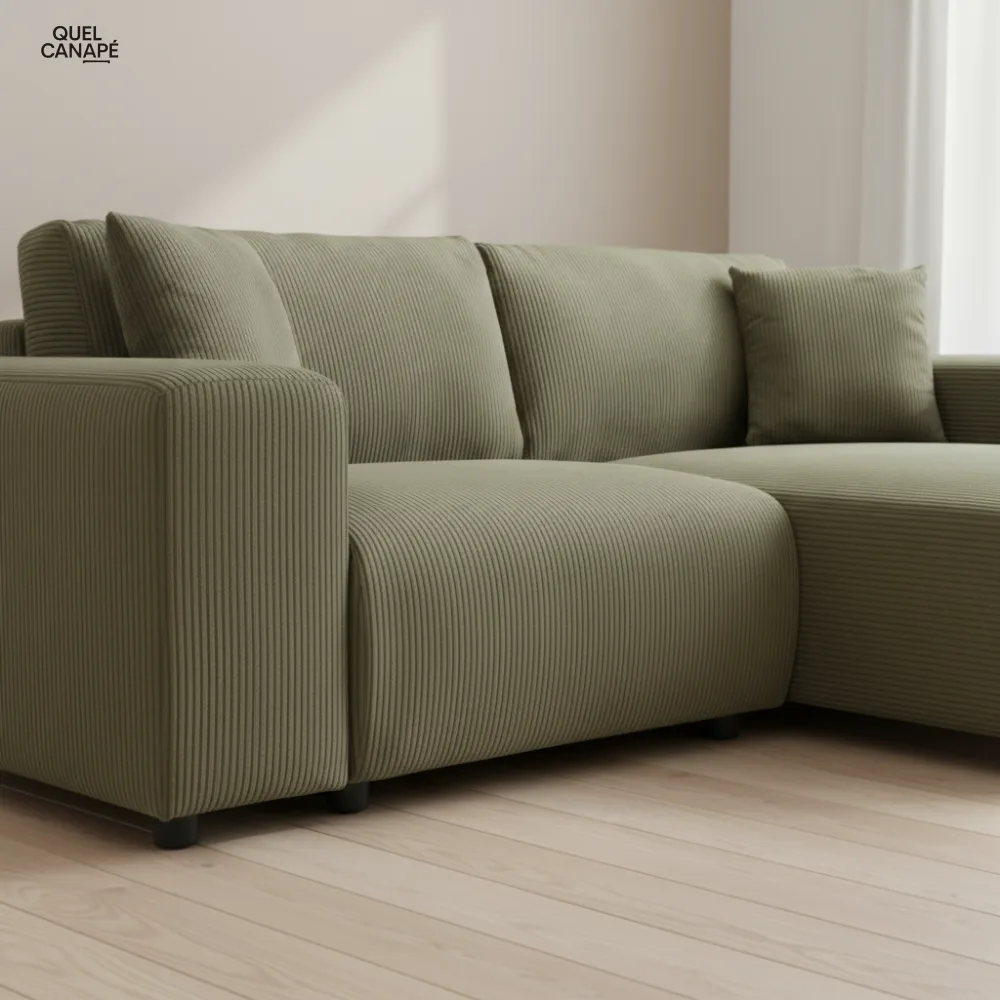Points d'attention néanmoins : l'entretien du velours côtelé demande un soin régulier et les coussins non déhoussables limitent les possibilités de nettoyage. Le prix de 999,90€ reste conséquent pour une densité de mousse secondaire de 25 kg/m³, qui pourrait s'affaisser à terme en usage intensif.