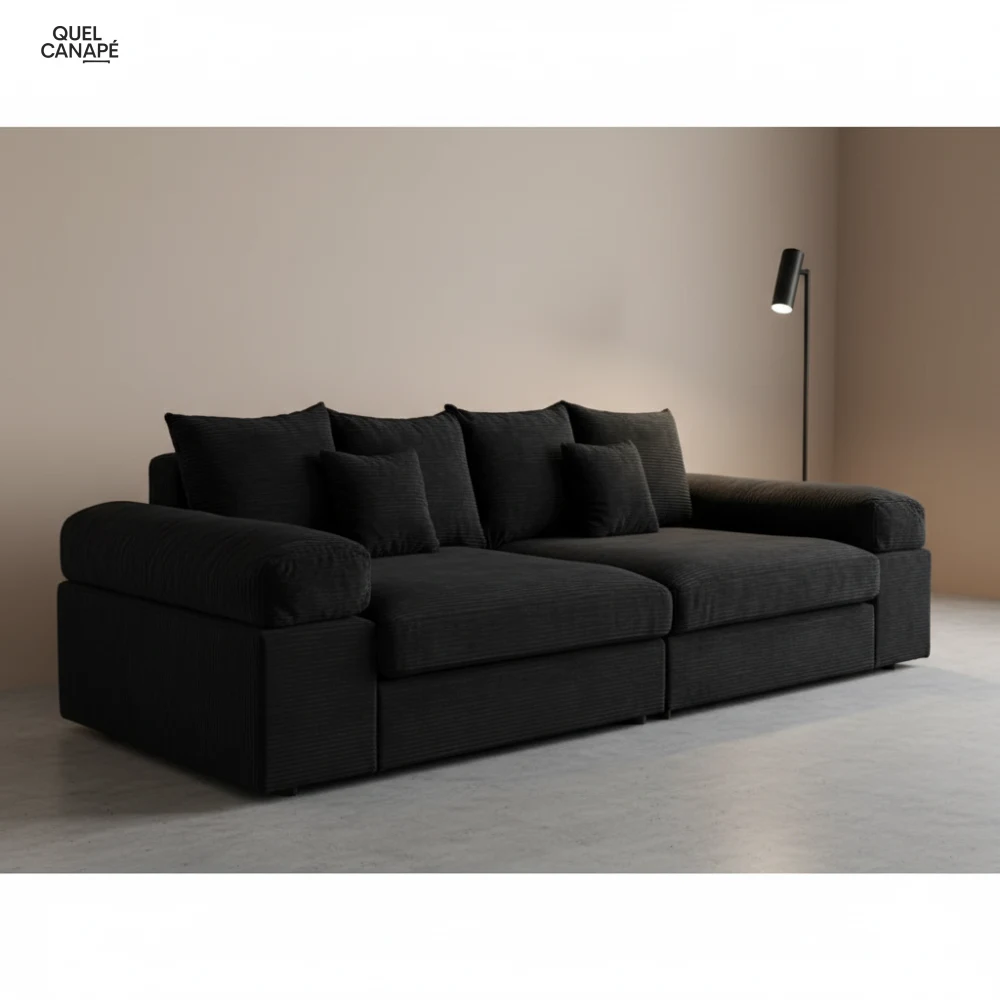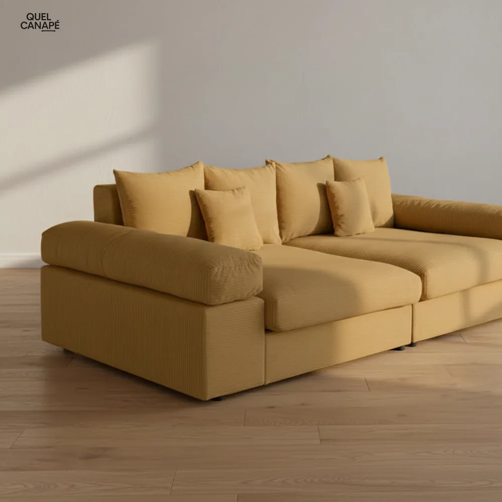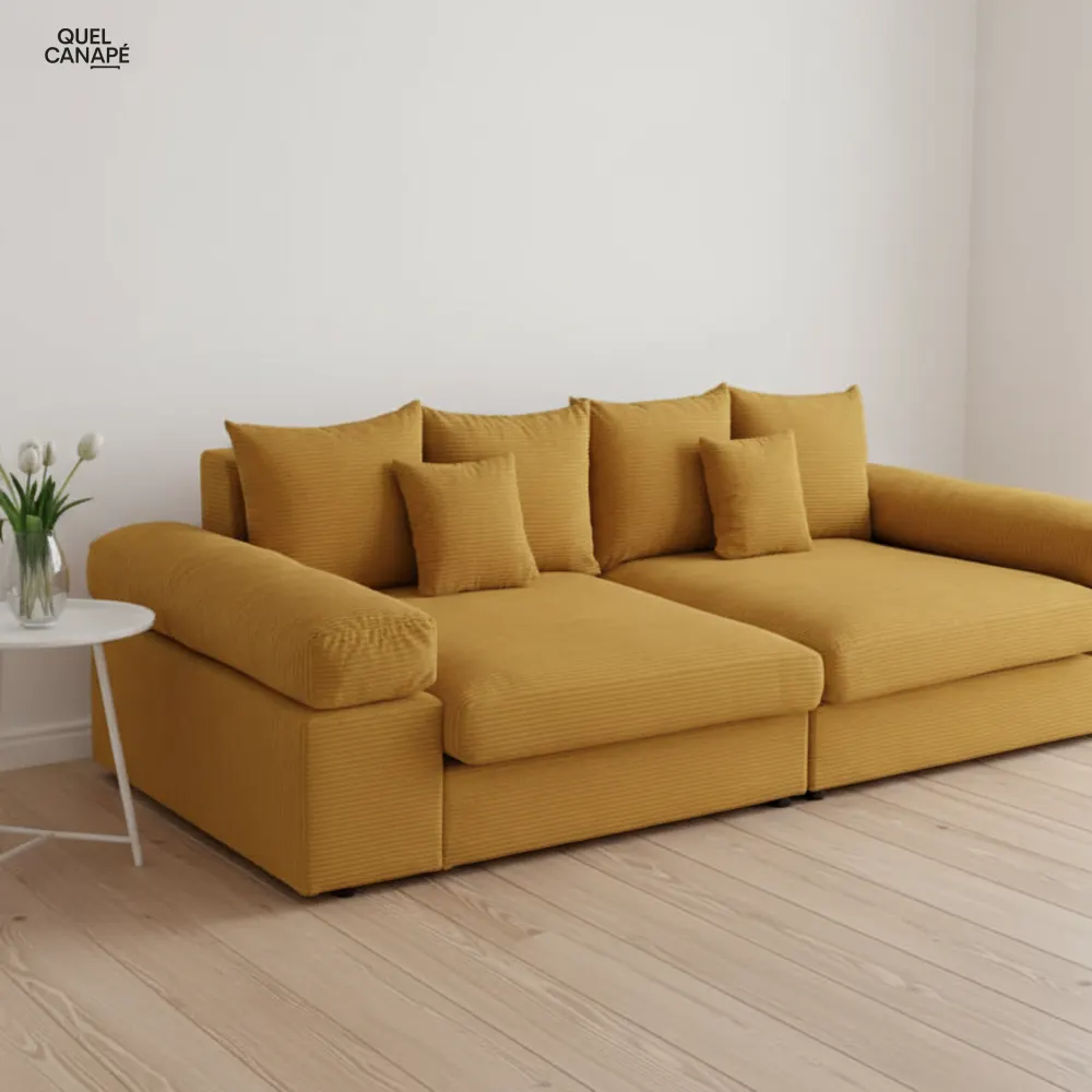 Le canapé Aspen mise sur l’espace et le confort avec ses 270 cm de largeur et son assise profonde de 88 cm. Sa mousse polyuréthane de 28 kg/m³ et ses ressorts ondulés offrent un équilibre fermeté-moelleux intéressant, tandis que le velours côtelé 100% polyester facilite l’entretien quotidien. Idéal pour les familles qui recherchent un canapé généreux sans se ruiner, avec un montage rapide garanti.