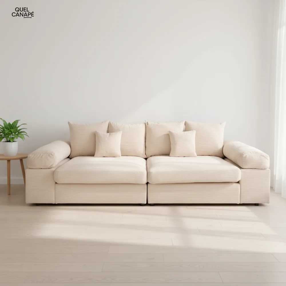 En définitive, l'Aspen représente un choix malin pour qui privilégie l'espace et le rapport qualité-prix. Ses dimensions exceptionnelles (270x135 cm) et sa mousse de densité correcte (28 kg/m³) renforcée par des ressorts ondulés procurent un confort familial satisfaisant. Vous apprécierez la fabrication européenne, le montage simplifié et la praticité du velours côtelé pour l'entretien.