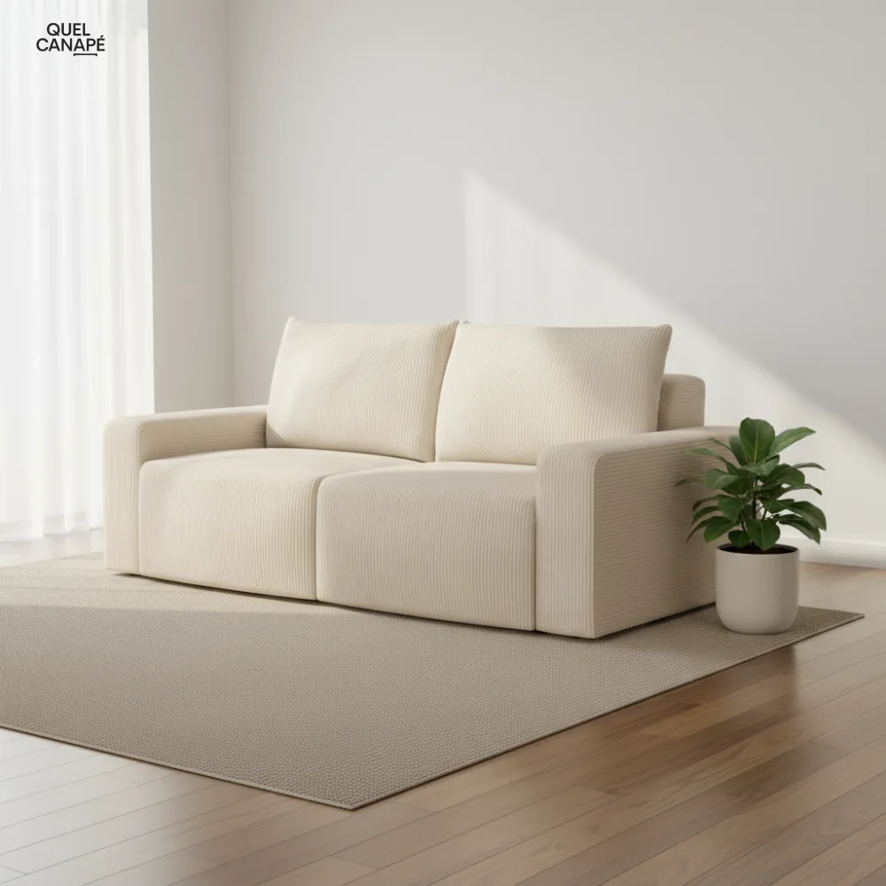 Le Canapé Romane mise sur l’élégance accessible avec son velours côtelé beige résistant et ses lignes arrondies modernes. Sa suspension mixte ressorts ensachés + zigzag offre un bon compromis fermeté/souplesse, tandis que la modularité de la collection permet d’agrandir votre salon selon vos besoins. Idéal si vous recherchez un canapé 2 places au design contemporain avec possibilité d’évolution future.