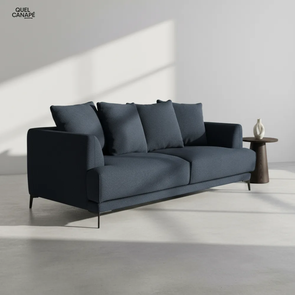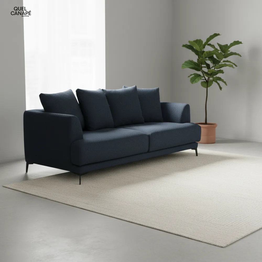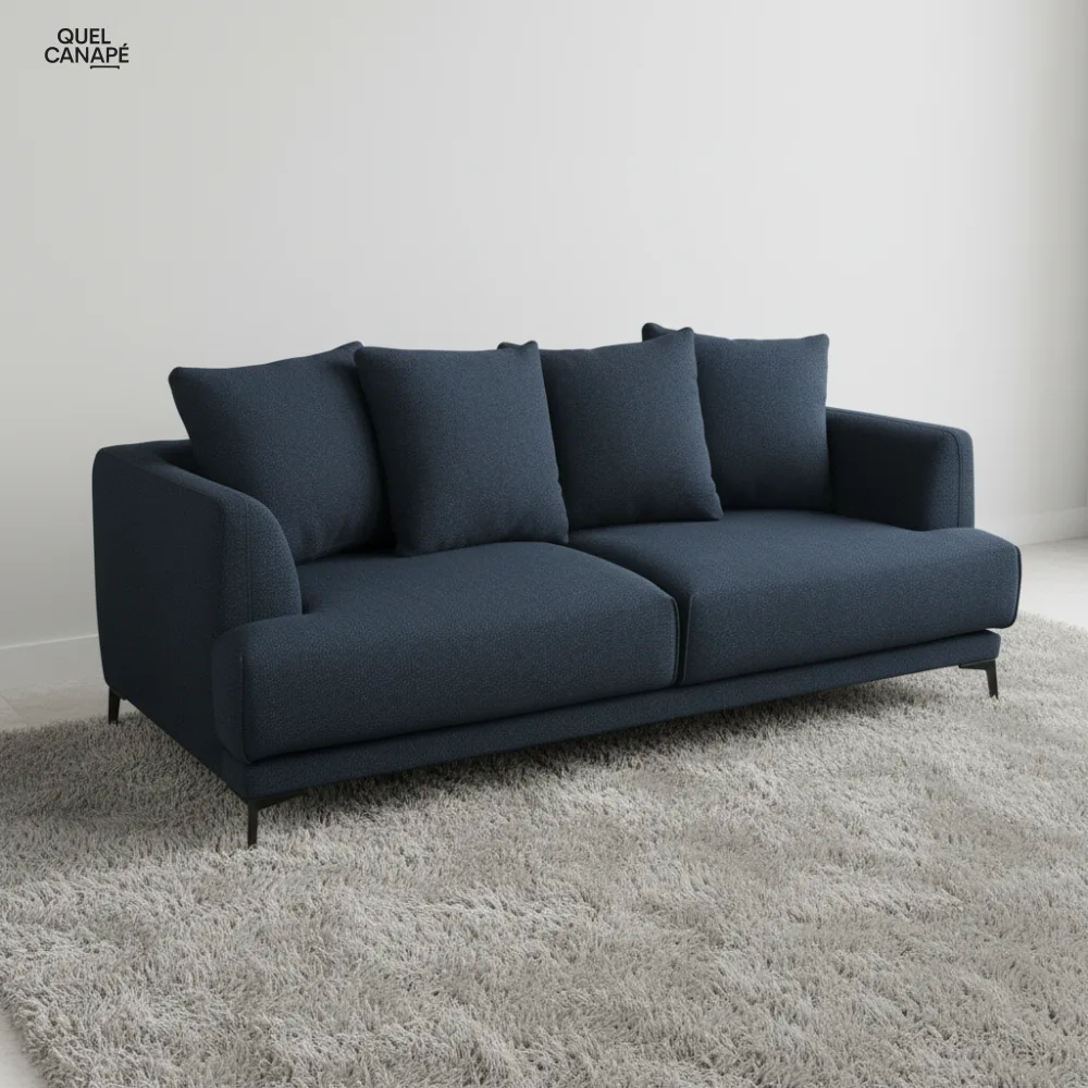Le canapé convertible Romy mise sur la polyvalence avec son matelas 12 cm en mousse haute résilience 30kg/m³ et son couchage 140×180 cm. Sa structure en bois massif (pin et hêtre) garantit solidité et durabilité, tandis que le tissu bouclettes bleu nuit apporte une touche sophistiquée. Idéal si vous recherchez un canapé-lit de qualité française alliant confort quotidien et solution d’appoint pour vos invités.