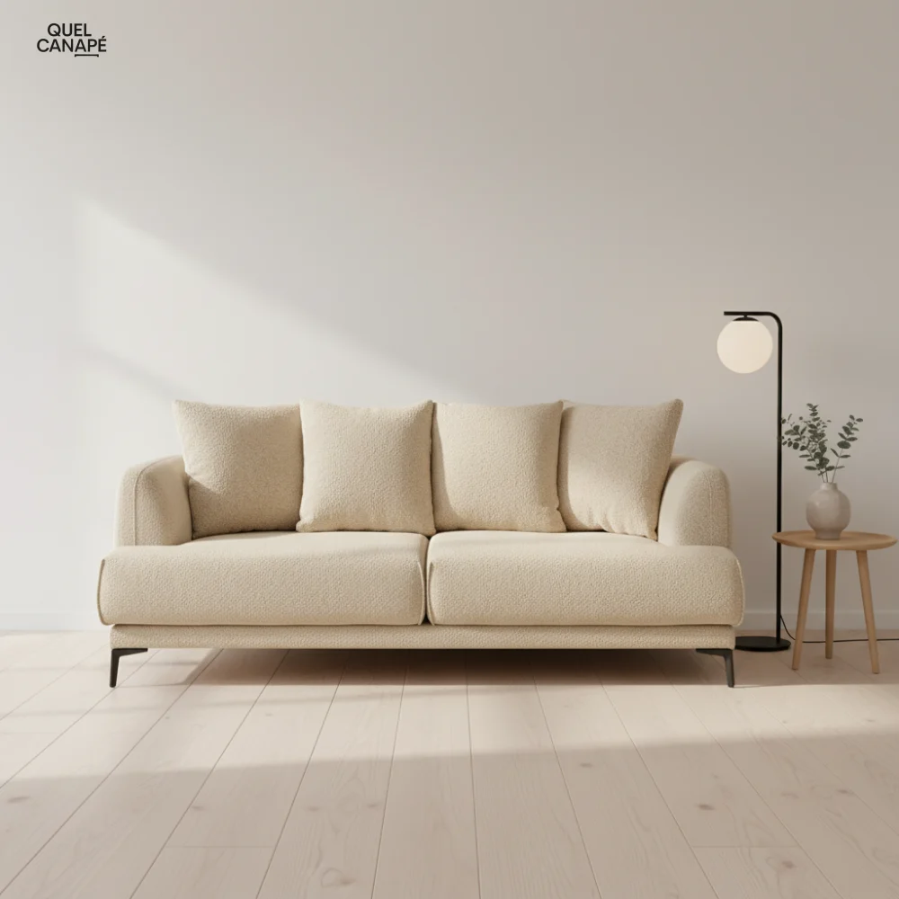 Le Romy se distingue par sa conception française soignée et sa double fonction parfaitement maîtrisée. Vous apprécierez la qualité du matelas 12 cm haute résilience qui offre un vrai confort de couchage, la robustesse de l'ossature bois massif (89 kg) et le charme du tissu bouclettes. Les dimensions généreuses (202 cm) conviennent aux salons familiaux, et la certification Good is Beautiful témoigne de l'engagement responsable.