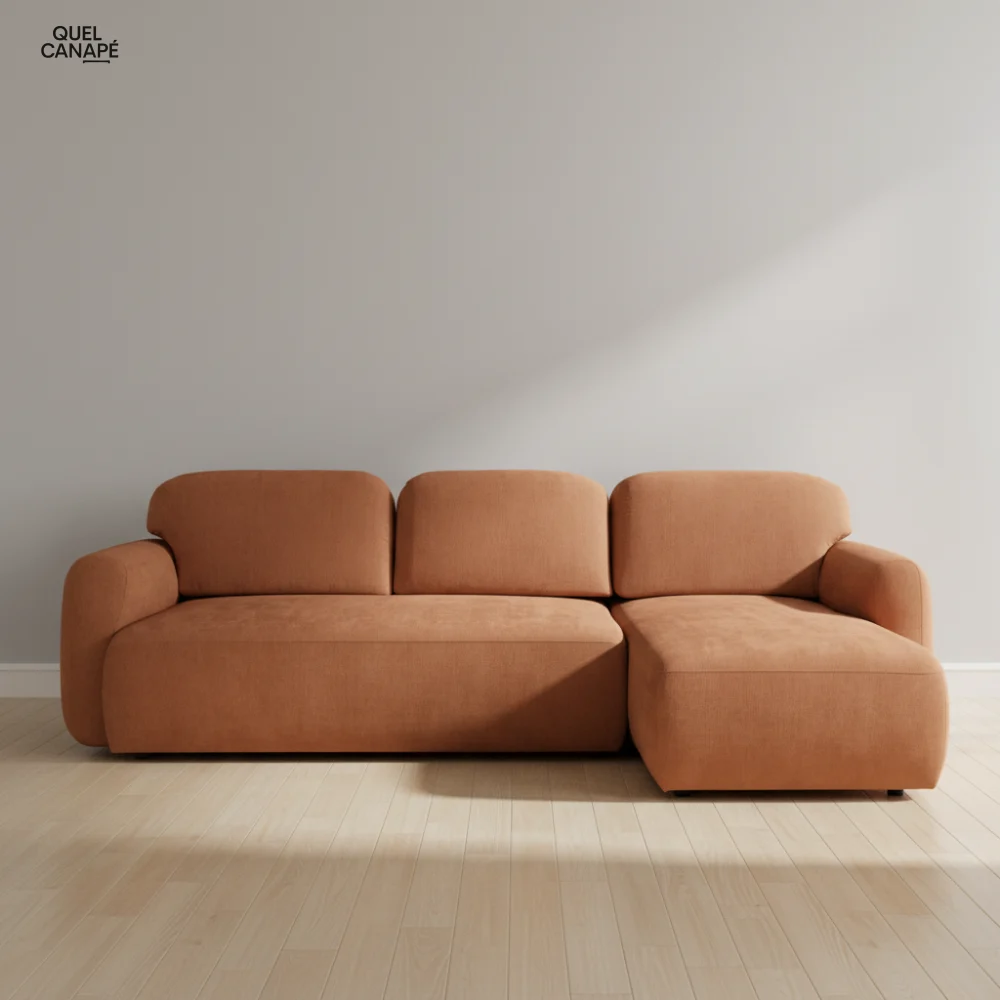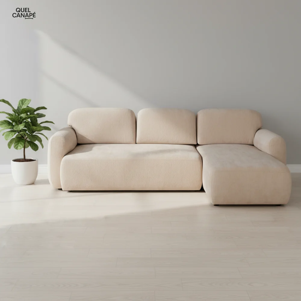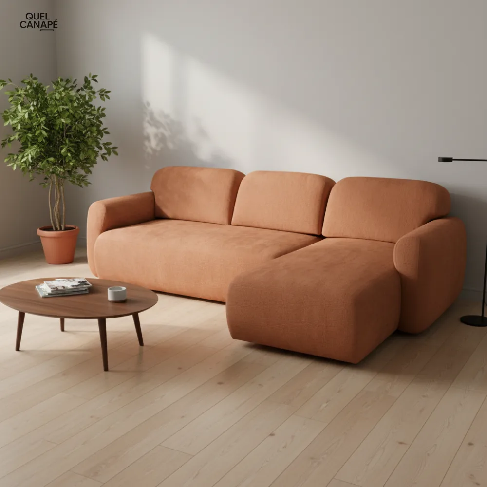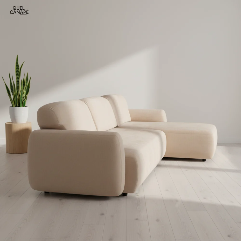 Le Canapé Bump fait sensation avec son approche écologique unique : tissu 100% polyester issu de bouteilles recyclées et structure pin FSC. Cette pièce convertible (couchage 144×206 cm) intègre astucieusement un coffre de rangement dans sa méridienne réversible. Son garnissage mousse 30 kg/m³ et ses dimensions généreuses (260×148 cm) conviendront parfaitement aux familles soucieuses d’environnement. Idéal si vous cherchez un canapé d’angle responsable et polyvalent.