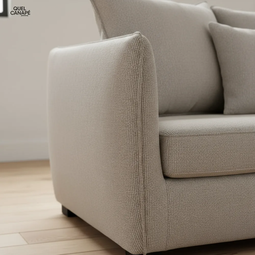 Attention cependant au prix de 1199€ qui reste élevé pour un revêtement polyester, et aux dimensions importantes qui nécessitent un salon spacieux. Le garnissage des coussins de dos en flocons de mousse polyester pourrait se tasser plus rapidement qu'une mousse pleine densité.
