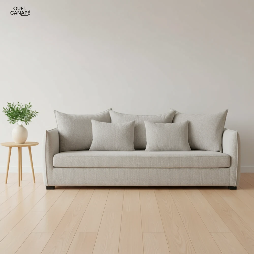 Le Canapé Lounge de Maisons du Monde mise sur la fabrication française avec ses 225 cm d’assise généreuse et son design contemporain intemporel. Sa structure en hêtre massif, sa mousse haute densité (26-35 kg/m³) et son revêtement polyester beige offrent un bon compromis qualité-durabilité. Les pieds wengé et les coussins amovibles apportent une touche d’élégance. Parfait si vous recherchez un canapé spacieux Made in France pour réunir toute la famille.