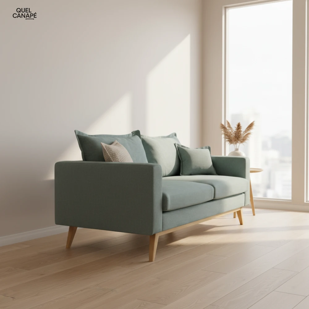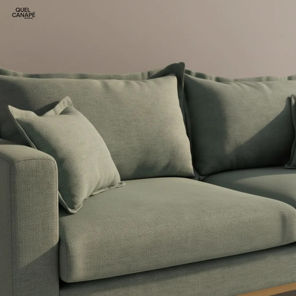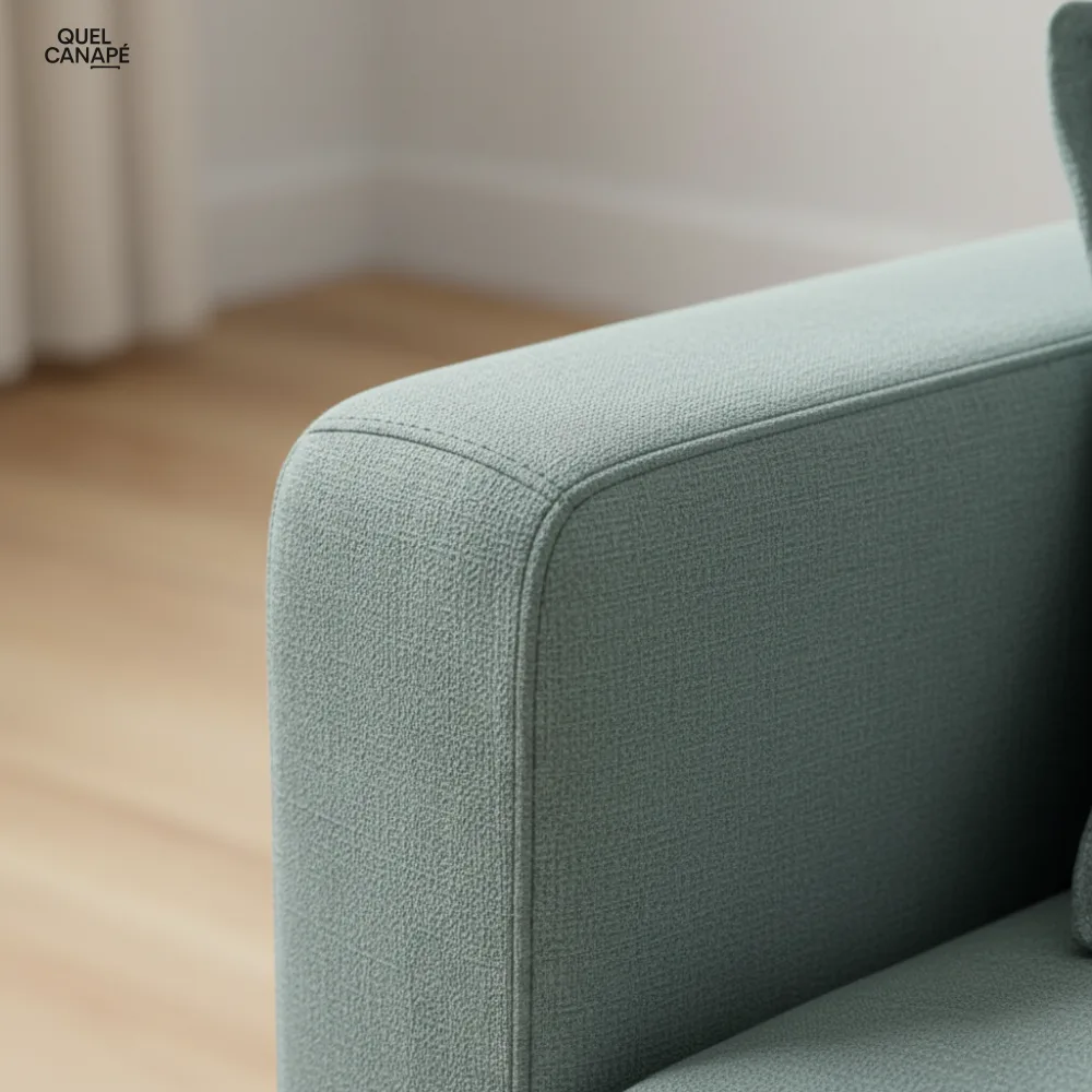 Gardez à l'esprit que ses dimensions imposantes (216 cm) nécessitent un salon spacieux, et que la densité des accoudoirs (25 kg/m³) reste plus basique que l'assise principale. La structure mélange pin massif et panneaux de particules, ce qui peut limiter la longévité par rapport à du bois massif intégral.